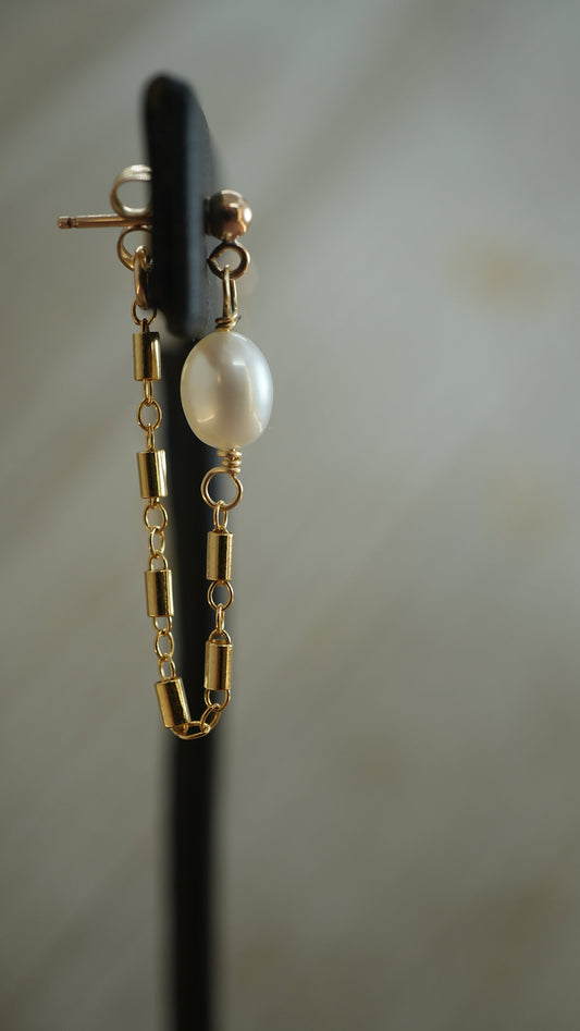 Gold Pearl Post Chain Hoops || 14K Gold Filled Earrings || Dangling Pearl Earrings