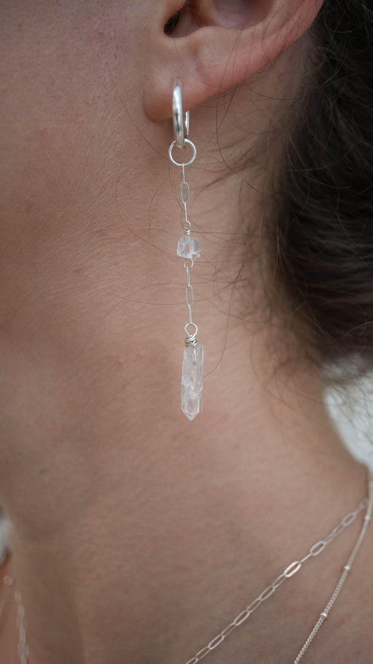 Long Silver Wanderlust Crystal Huggers | 925 Sterling Clear Quartz & Herkimer Diamond | Bridal Earrings | Bridal Jewelry | Silver Hoops