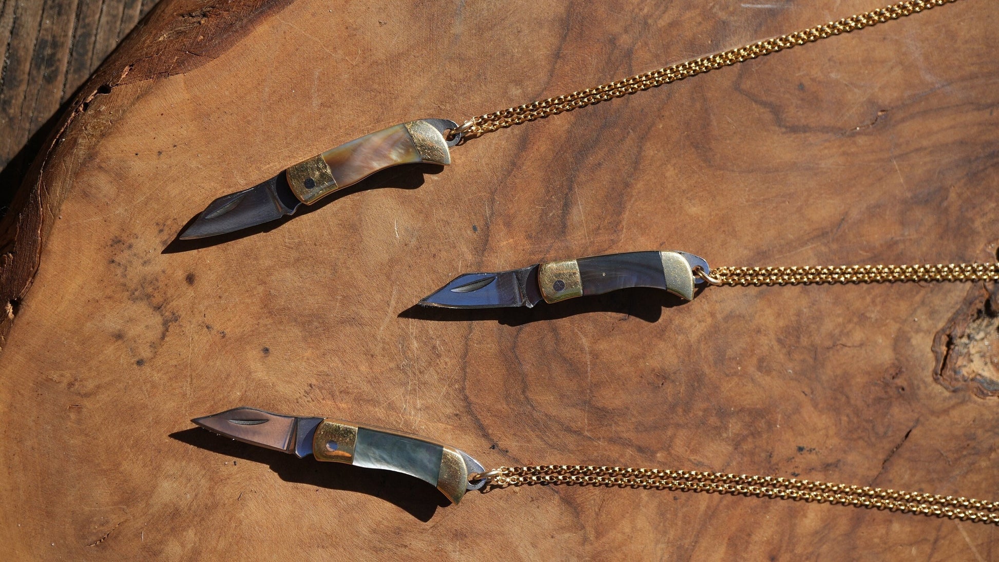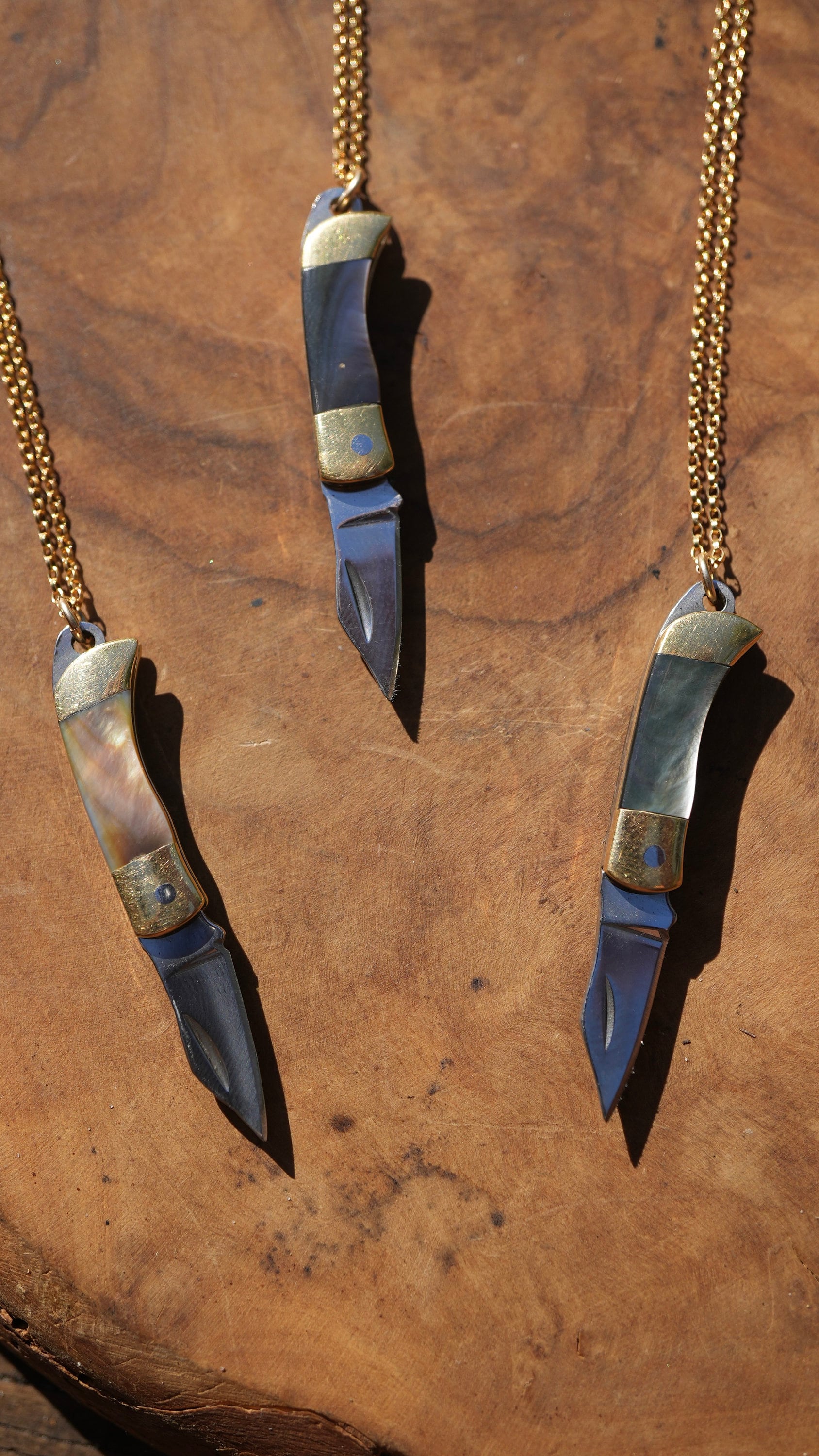 A beautiful folding knife necklace, crafted with stainless steel and brass and natural white shell abalone. These necklaces are unisex and the perfect gift. Coming hung on either a 14k gold filled chain or sterling silver of your desired chain length, please select from the drop down menu.
